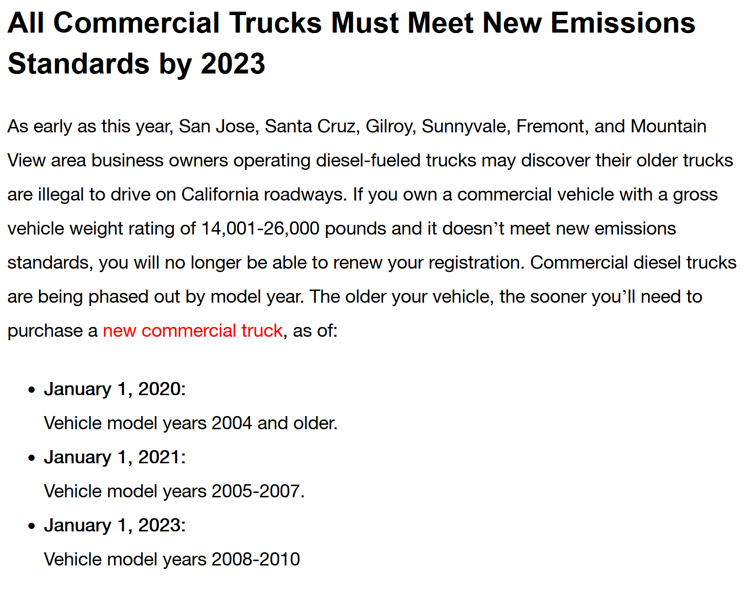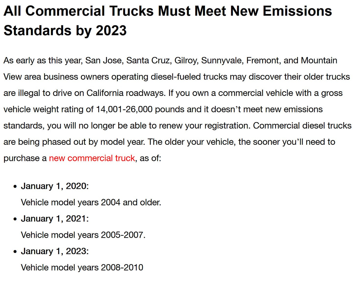 California passed legislation requiring trucks to meet new emissions standards by 2023, but they starting phasing in requirements beginning in January 2020.